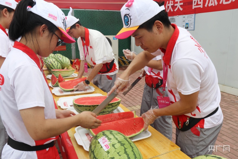 志愿者们在切西瓜(央广网记者 刘培俊 摄)
