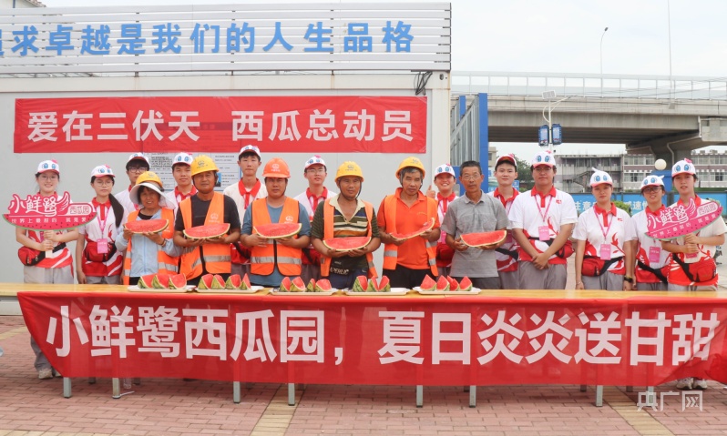 央广网南昌7月16日消息(记者刘培俊 见习记者周蓓)7月15日,入伏首日,烈日炎炎,酷热难挡,空气中都弥漫着热浪的气息。在这个酷暑时节,江西南昌的小鲜鹭志愿者们带着亲手采摘的西瓜,走进繁忙的建设工地,为辛勤劳动的工人们送上丝丝清凉与深深关怀。